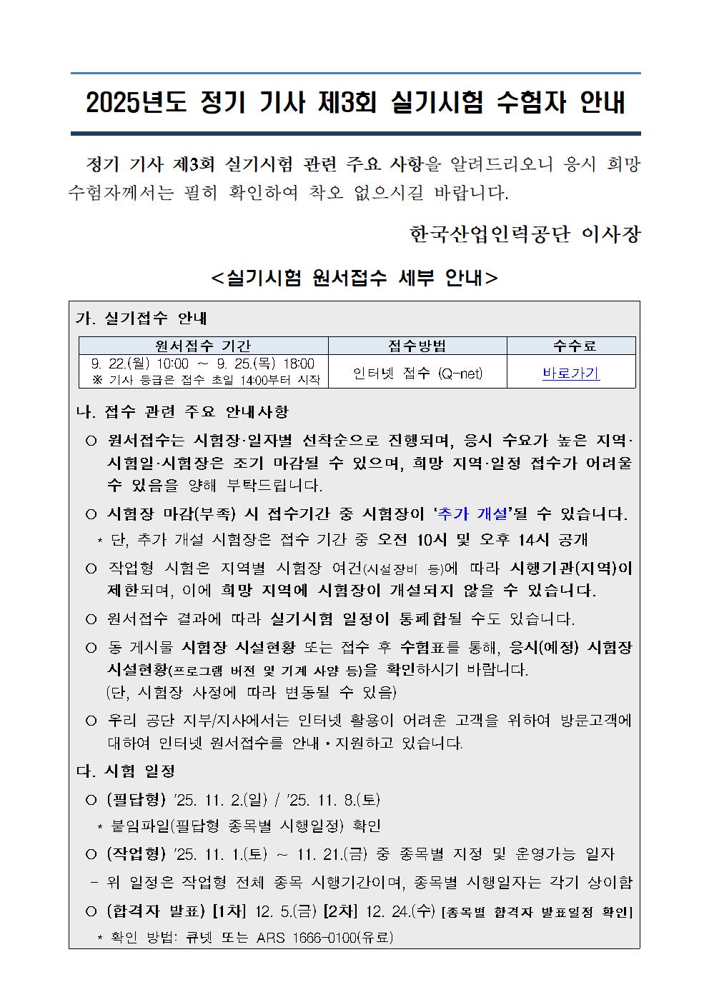 ★ 장시간 대기를 방지하기 위해 시험장 추가 개설은 매일 10시, 14시에 되오니 참고하시기 바랍니다. ○ 사전입력 : 2025.09.18.(목) 14:00 ~ 09.21.(일) 23:59 ○ 2025년도 정기 기사 제3회 실기시험 원서접수 안내문, 필답형 시험일정 및 시험장(예정), 작업형 시설장비 현황(예정)을 사전공개하오니, 원서접수 시 참고하시기 바랍니다. ○ 필답형 시험장 및 작업형 시설장비는 수험자 편의를 위해 제공하는 참고용 자료이며, 실제 접수 시 개설 시험장과 차이가 발생할 수 있음을 알려드립니다. ○ 필답형 시험장 및 작업형 시설장비 현황 정보는 원서접수 전 매일 14시, 18시 기준으로 업데이트 예정입니다. ○ 작업형 실기시험장의 경우 시험장 임차 관련 최종 조율이 이루어짐에 따라, 사전 공개가 어려우며, 수험자 혼동 예방을 위하여 원서접수 시 확인하실 수 있습니다. ○ 시설장비 사전 공개에 해당하지 않는 작업형 시험장은 관할 지부, 지사로 문의 부탁드립니다.