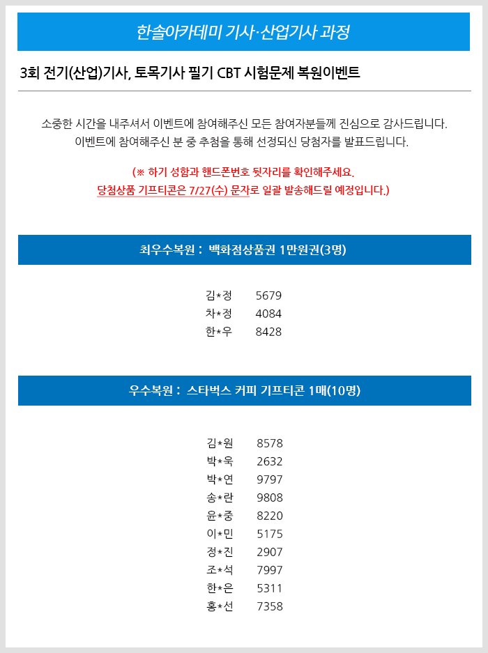 2022년 제3회 전기(산업)기사/토목기사 필기CBT시험문제 복원이벤트 당첨자 발표